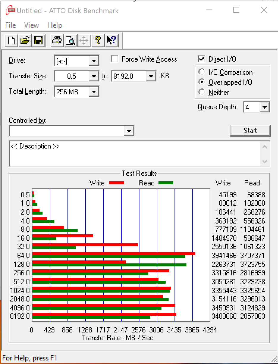 ATTO Disk Benchmark is perhaps one of the oldest benchmarks going and is definitely the main staple for manufacturer performance specifications. ATTO uses RAW or compressible data and, for our benchmarks, we use a set length of 256mb and test both the read and write performance of various transfer sizes ranging from 0.5 to 8192kb. Manufacturers prefer this method of testing as it deals with raw (compressible) data rather than random (includes incompressible data) which, although more realistic, results in lower performance results.