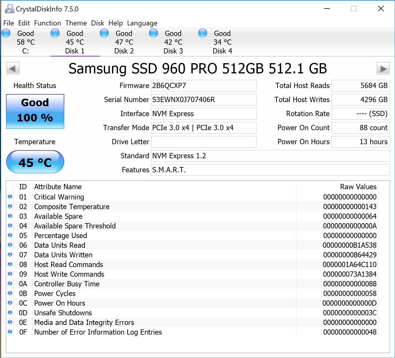 Disk 1,2,3 and 4 are our Samsung 960 Pro M.2 SSDs in this Crystal Disk Info picture and represent our OS softRAID. It is a great way of confirming that, in fact, each is routing data through their own PCIe Gen 3 four lane configuration.