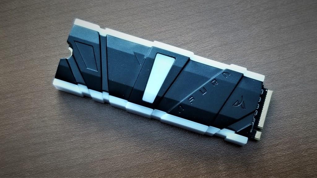 The SSD itself was protected by a four piece plastic heatsink with metal plates to dissipate heat on both sides. It was held together by a combination of screws, clips and thermal tape holding the SSD to the metal plate of the heatsink. It was evident that this SSD also had active LEDs once plugged in and was a task to disassemble.