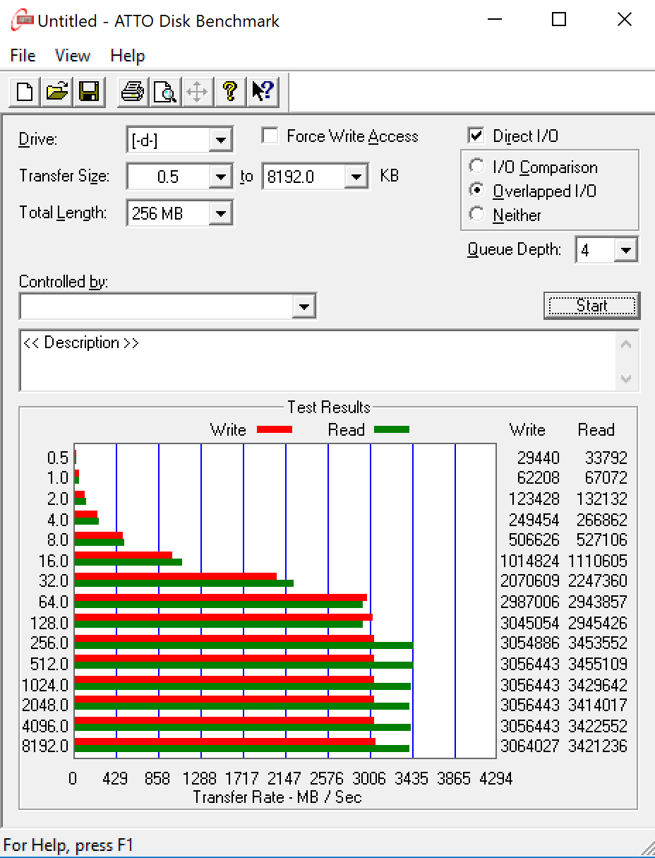 ATTO results are excellent for this SSD and display a very strong and steady speed increase as sample size increases. It demonstrates top speeds of 3.45GB/s read and 3.0GB/s write.