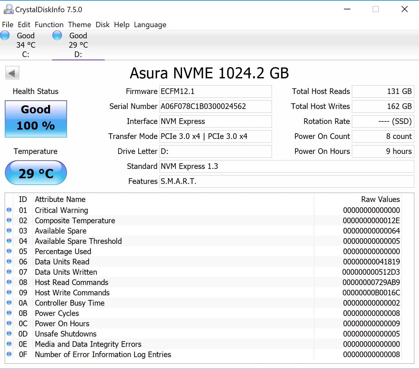 Crystal Disk Info is a great tool for displaying the characteristics and health of storage devices. It displays everything from temperatures, the number of hours the device has been powered, and even to the extent of informing you of the firmware of the device.