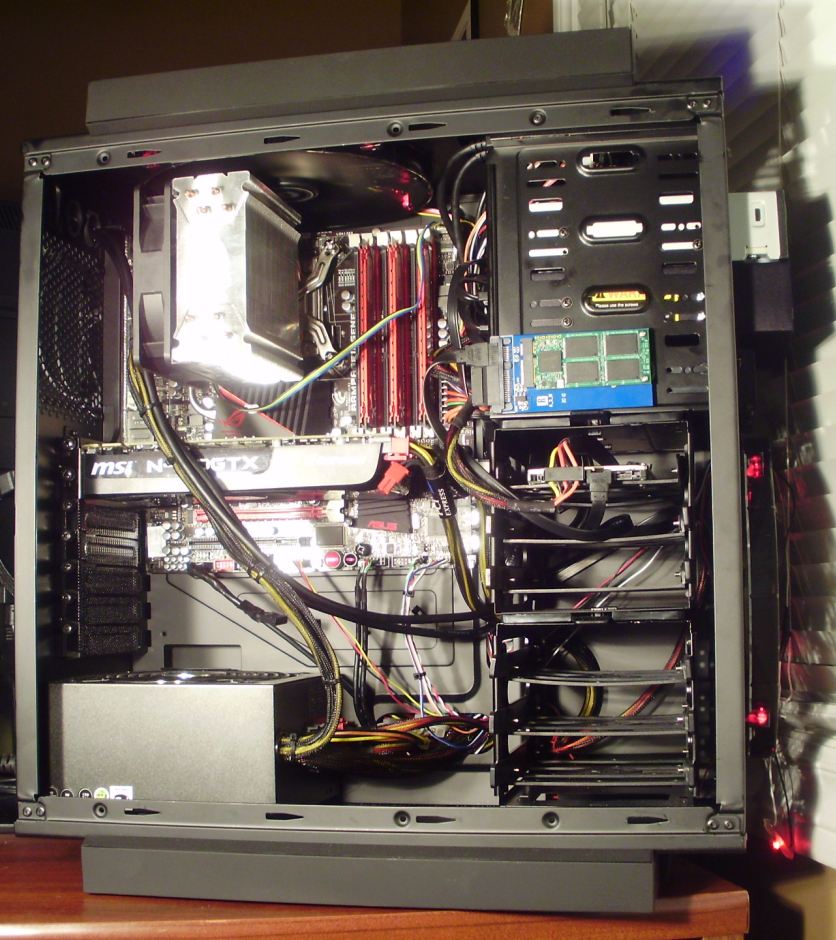 On the right, one can see modular bays which can accomodate up to 7×3.5″ or 9×2.5″ hard drives or SSDs. The interesting thing we noticed was that the modular bays slid out easily with a click and could make room for any abnormally large PCI cards if need be. As well, the bracket with each bay slides out for easy installation of the drive onto the bracket. At the end of the day, we know we can use a course in cable management ourselves but here is the final product with all components installed, including 5 solid state drives, a desktop and laptop hard drive.