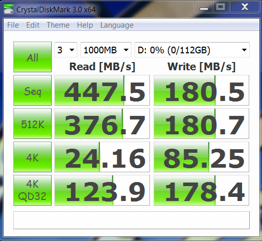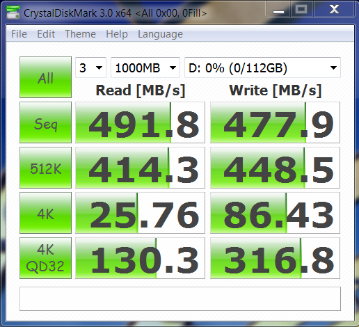 The 4k random write performance of 85MB/s is decent but we expected the high sequential write results from the result on the right, where highly compressible data was used for testing, to be somewhat higher as premium synchronous NAND flash memory is being used by the SSD.