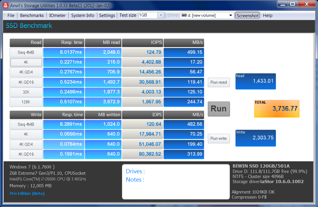 Over the last little while, we have been assisting with beta testing new benchmark software called Anvil Storage Utilities which is an absolutely amazing SSD benchmarking utility. Not only does it have a preset SSD benchmark, but also, it has included such things as endurance testing and threaded I/O read, write and mixed tests, all of which are very simple to understand and utilize in our benchmark testing.