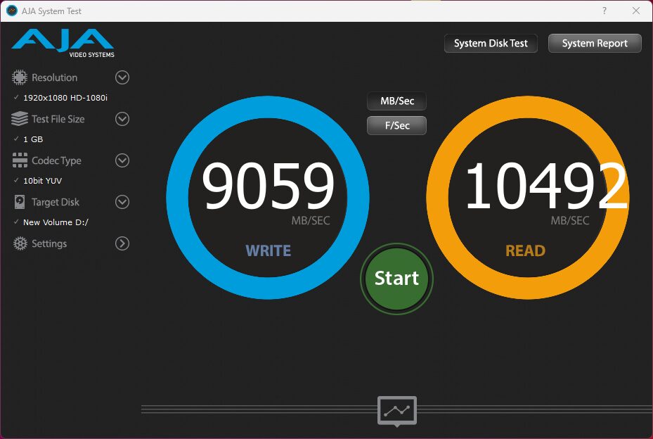 The AJA Video Systems Disk Test is relatively new to our testing and tests the transfer speed of video files with different resolutions and Codec.