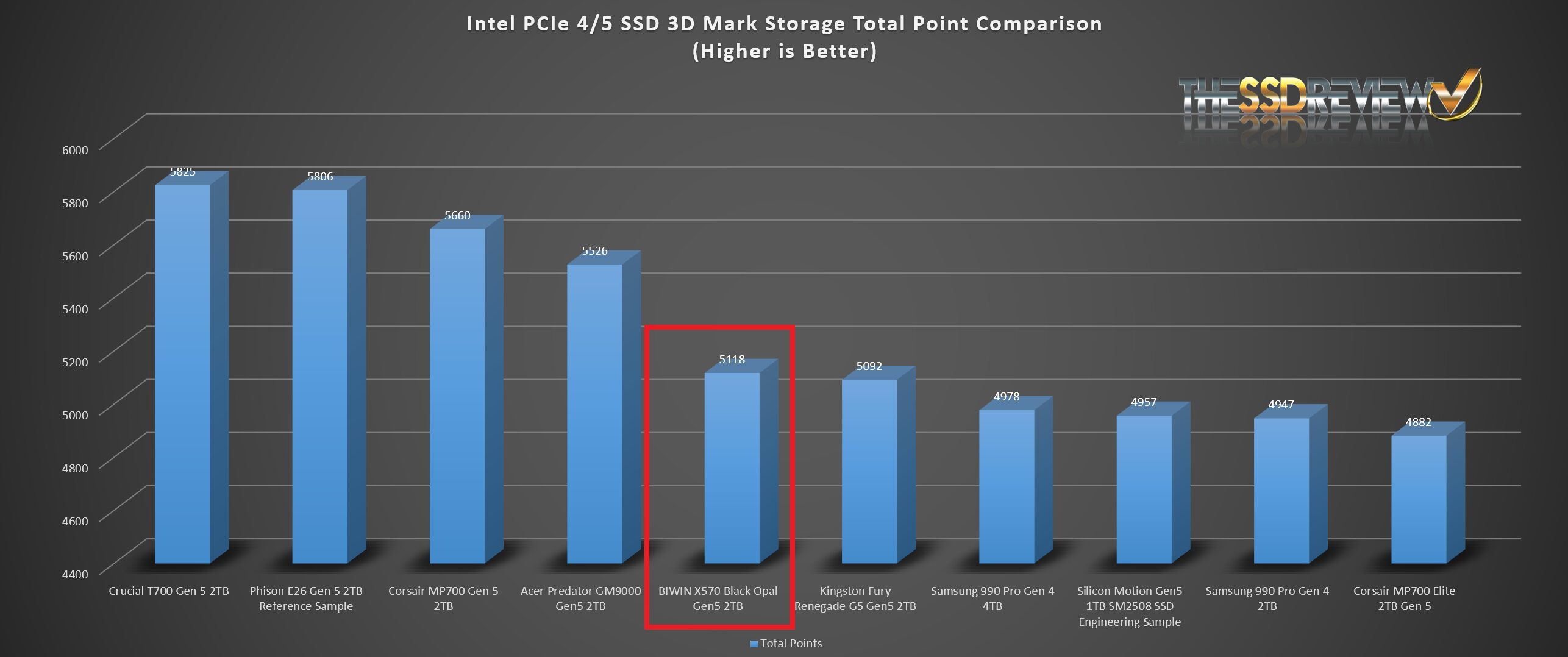 The BIWIN X570 Black Opal Gen5 DRAMless SSD surpassed a few Gen5 SSDs in this 3DMark Storage Benchmark.