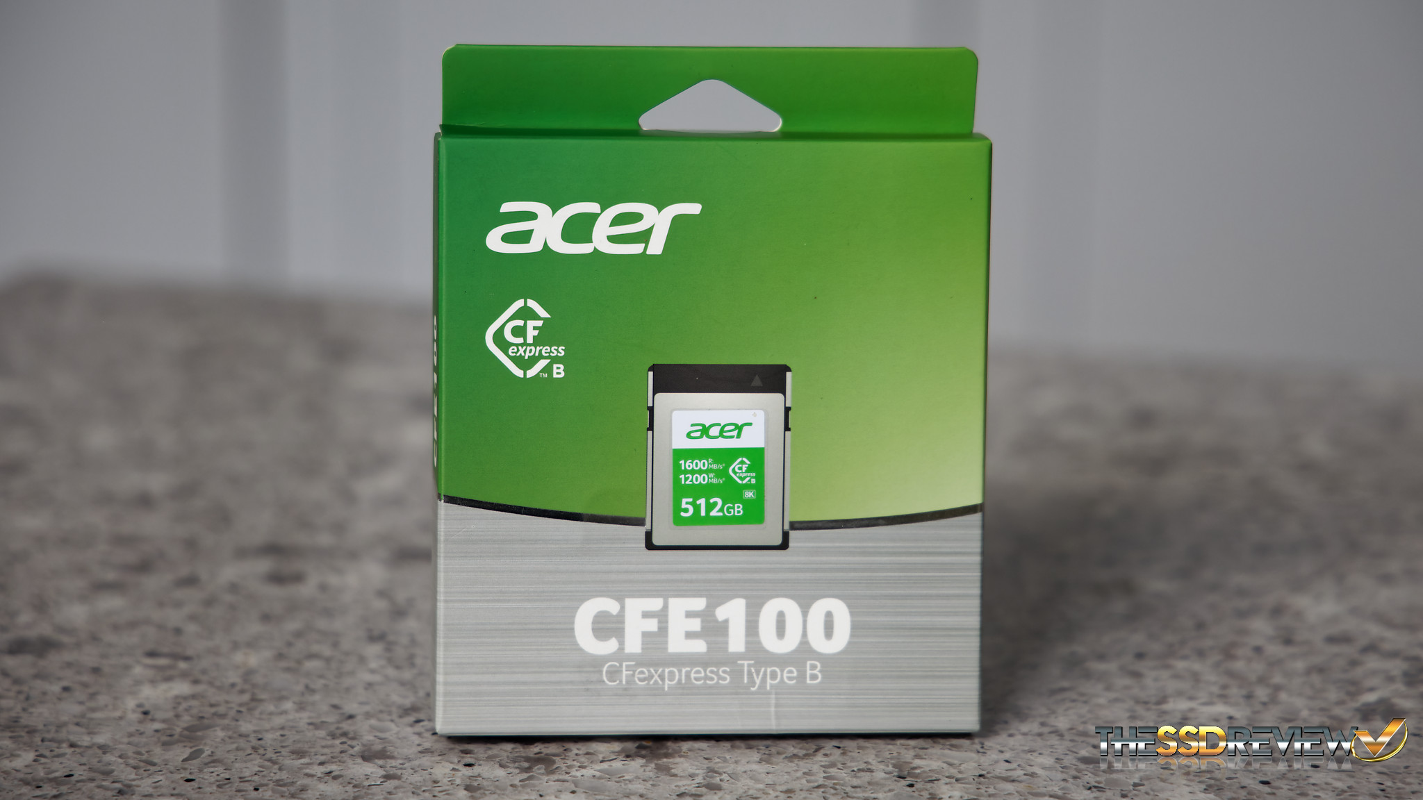 On the bench today, we have Acer’s latest CFExpress Type B Memory card, the CFE100 and our sample is the 512GB size. Stamped right on the front of the card are its specs of 1600MB/s read and 1200MB/s write and an 8K stamp leading us to believe that this card is capable of 8K recording. This would mean that it has decent sustained write performance, although this doesn’t seem to be indicated anywhere. This card, designed and manufactured by BIWIN Technologies for Acer, is also listed as being backwards XQD compatible, anti-static, x-ray proof, magnet proof and UV guarded.