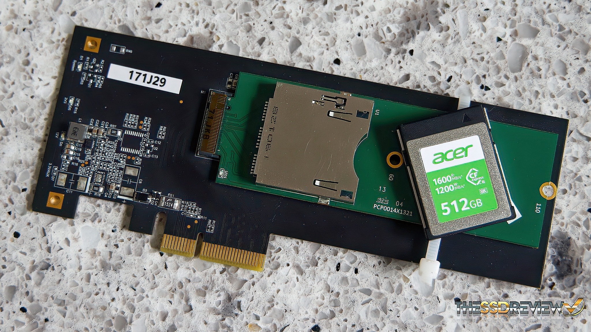 For our testing today, we will be relying on the pictured PCIe 3.0 x4 CFExpress reader created for us by Lexar some time ago. As a bit of confirmation, we always test with multiple readers we have on hand and of both the ThunderBolt 3 and the newer USB 3.2 2×2 spec. There shouldn’t be a difference in any of these devices as the top speed of CFExpress is well below the threshold of all readers ( and our AIC Gen 3 reader), whether they be Thunderbolt 3/4 with a threshold of 2.8GB/s or USB 3.2 2×2 with a top speed of 2GB/s.