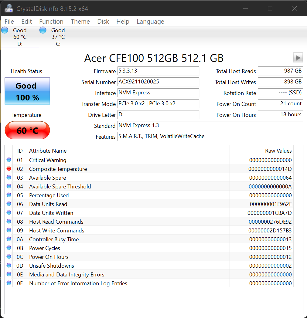 Crystal Disk Info is a great tool for displaying the characteristics and health of storage devices. It displays everything from temperatures, the number of hours the device has been powered, and even to the extent of informing you of the firmware of the device.