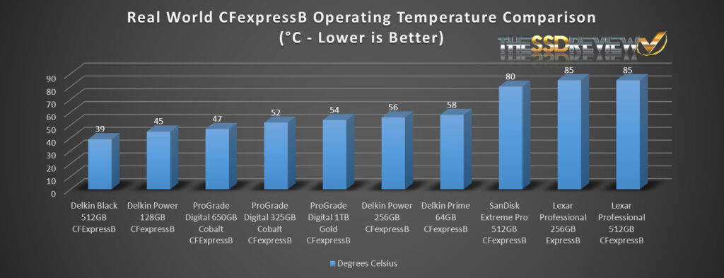 The lower the better and the Delkin 512GB Black CF Express Type B Memory Card literally blows away the competition with its low temperature of 39°C during sustained write data transfer. This temperature was achieved at a point when others couldn’t resist reaching higher temps. In fact, even now with this card sitting in the PC for several hours, its ambient temperature is all of 29°C which is unheard of for a CFExpressB card.
