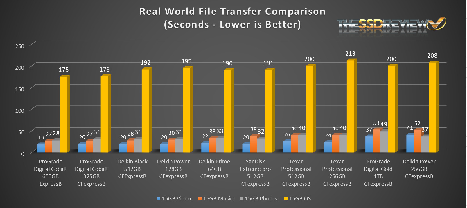 For our Real World File Transfer Comparison of the world’s top CFexpress Type B cards, we have included all cards that we have received to date. This test is conducted through the transfer of data from one spot on the test drive to another to give us the truest of transfer speed results for that device.