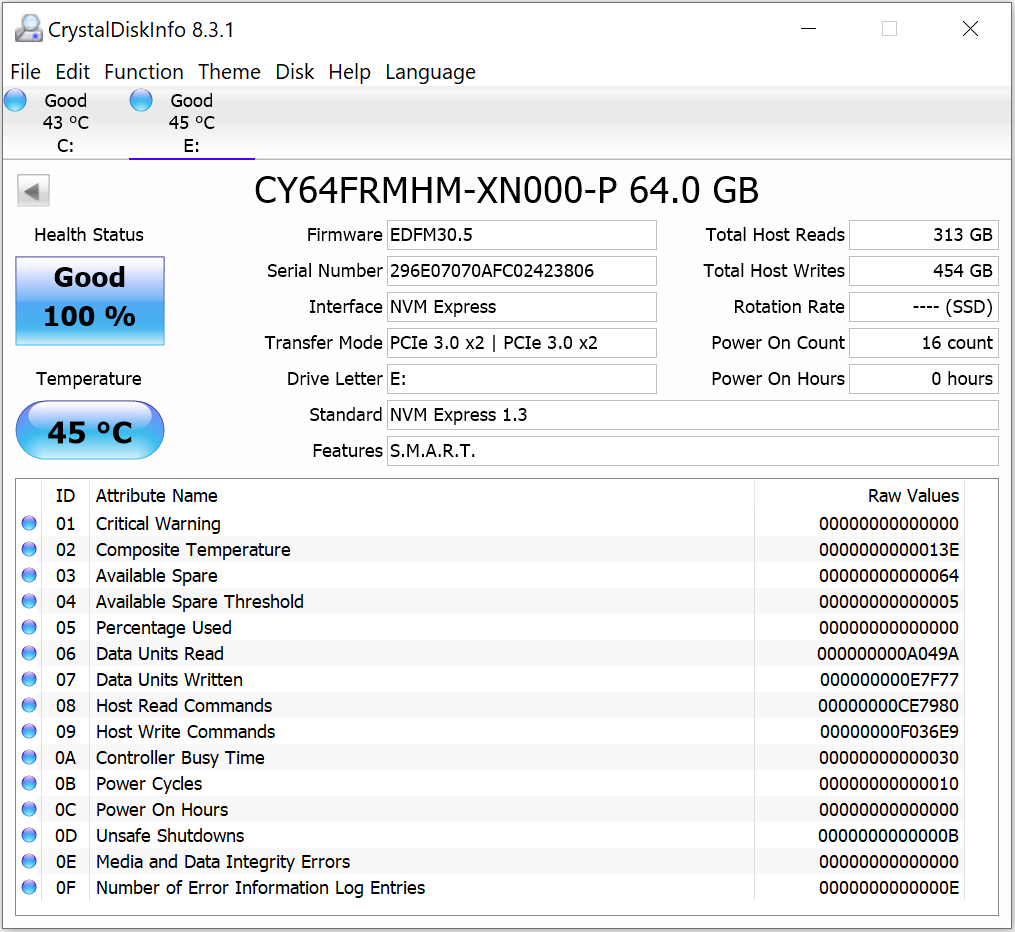 Crystal Disk Info is a great tool for displaying the characteristics and health of storage devices. It displays everything from temperatures, the number of hours the device has been powered, and even to the extent of informing you of the firmware of the device.