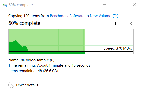 Although not advertised, we tested this card for both sustained write performance and also monitored the temperature during this test. The highest temperature this card reached was 56°C and its sustained right performance was 370MB/s.