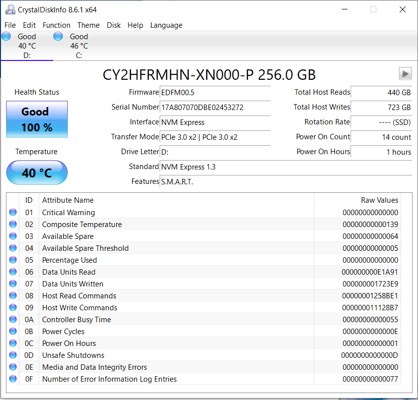 Crystal Disk Info is a great tool for displaying the characteristics and health of storage devices. It displays everything from temperatures, the number of hours the device has been powered, and even to the extent of informing you of the firmware of the device.
