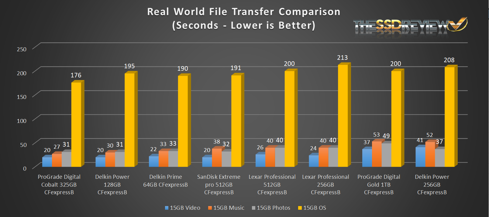 For our Real World File Transfer, we move four folders of video, music, photos and OS files from one place on the CFexpress card to another. The Lexar Professional once again had decent transfer speeds.