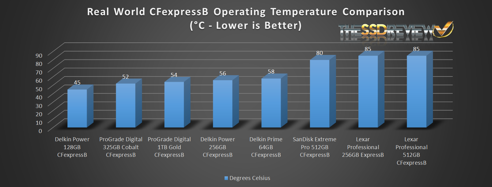 To date, the Lexar Professional has one of the highest temperatures seen in a CFexpress card, but this hasn’t curbed their performance, sales or reputation. We were able to reach a maximum speed of 85°C with some effort and it never throttled, much as the SanDisk Extreme Pro does at 65°C. Our testing consists of moving 85GB of 8K video onto the card, much like the R5 would store 8K video simultaneous to recording.