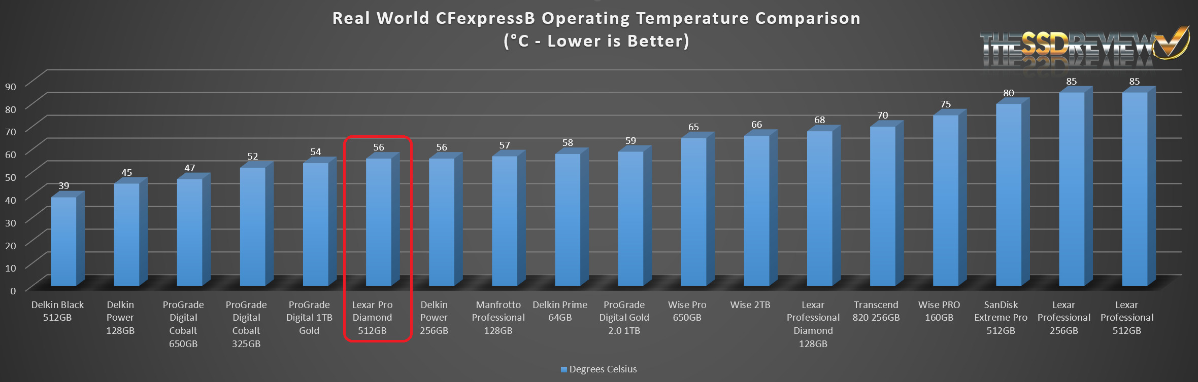 Lexar has dropped its maximum temperature significantly since its earlier release of the 128GB capacity of this same card a few months back. This is especially appealing when you consider that the Lexar professional Diamond has the fastest sustained write transfer speed on the market right now.