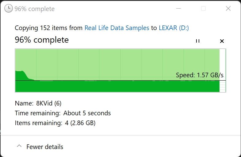 We determine sustained write performance by transferring a 85GB 8K media folder from the PC to the CFexpress Type B card. This test is vital to those looking at digital storage for high end 4K and 8K video recording.