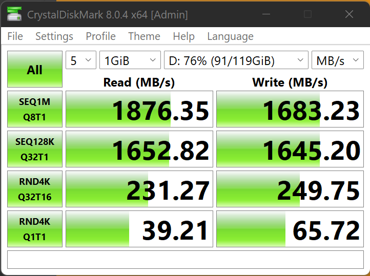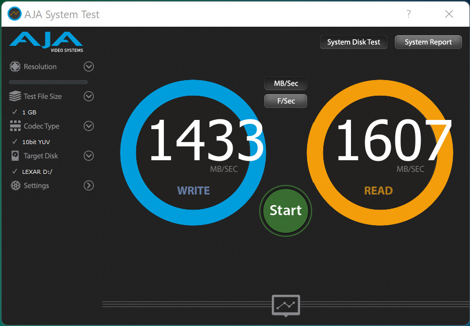 The AJA Video Systems Disk Test is relatively new to our testing and tests the transfer speed of video files with different resolutions and Codec.