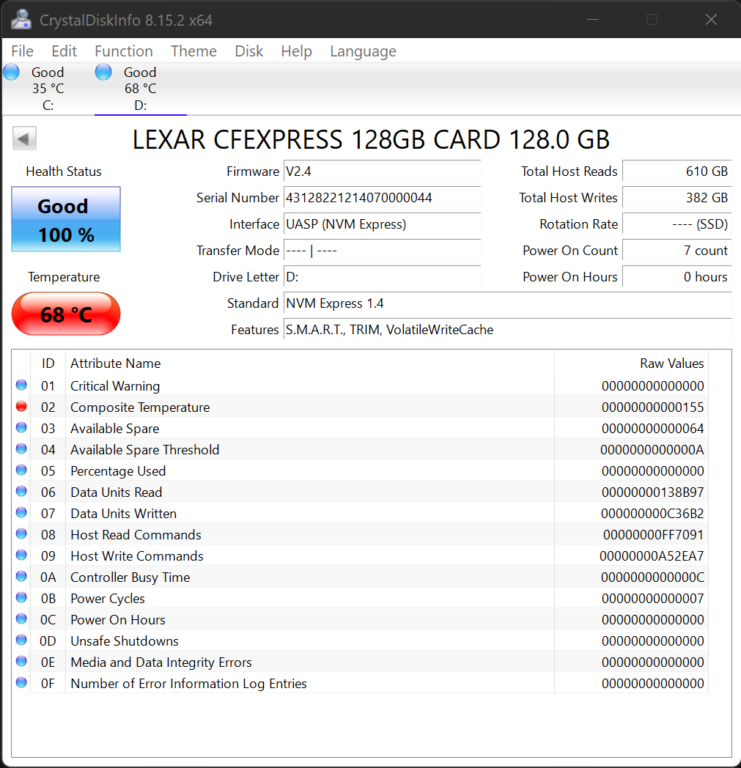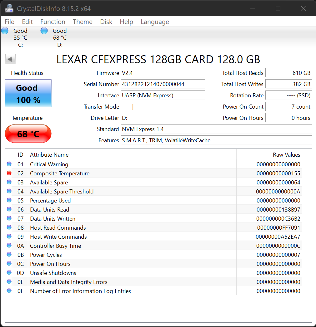 In posting this Crystal DiskInfo result, it is our practice of identifying the highest recorded temperature reached during our test regimen. 68°C is an above average temp…but by no means the highest we have seen to date.