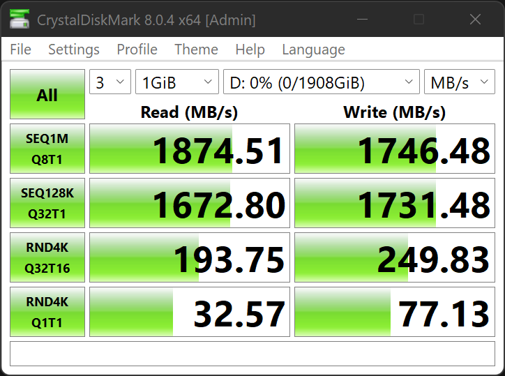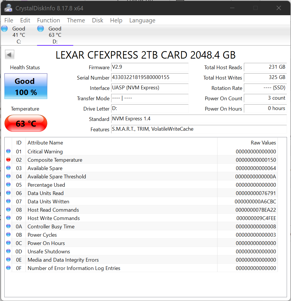 In posting this Crystal DiskInfo result, it is our practice of identifying the highest recorded temperature reached during our test regimen. 63°C is a bit higher than we recently had in our Lexar Diamond Professional CFExpress B testing but really not that bad, considering the demands of our test regimen.