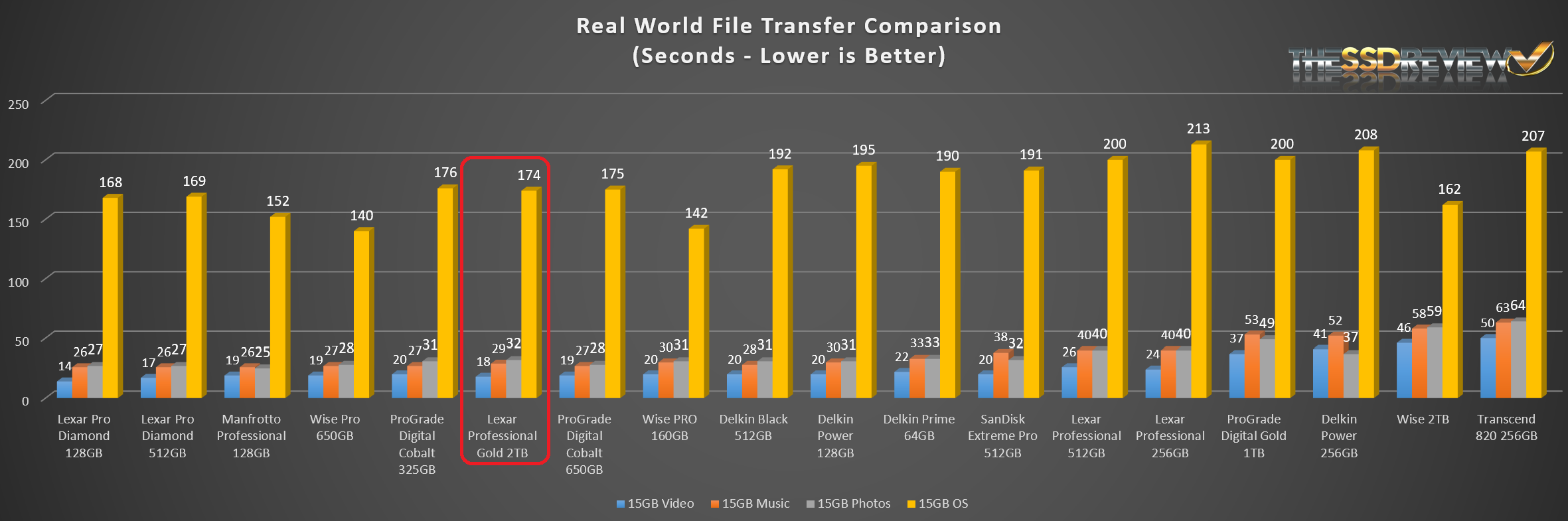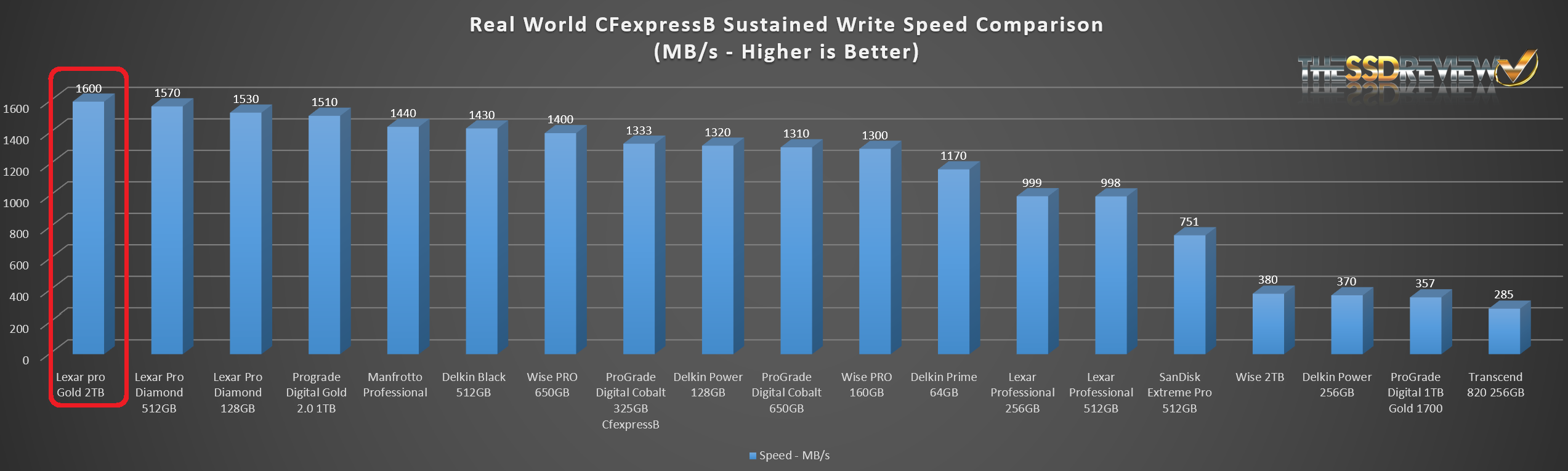 The Data Transfer speed of the Lexar Professional Gold Series 2TB CFExpress Type B Memory Card is a very respectable 6th best of all cards tested to date.