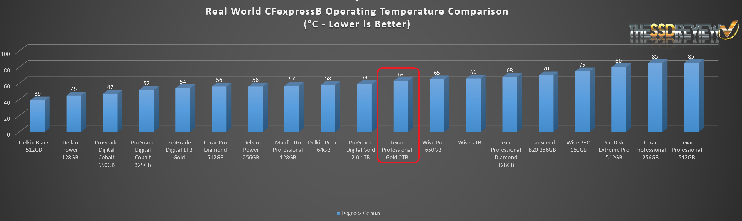 Lexar has dropped its maximum temperature significantly since its earlier release of the 128GB capacity of this same card a few months back. This is especially appealing when you consider that the Lexar Professional Gold 2TB memory card has a very healthy sustained write transfer speed making it a very attractive card for media professionals.