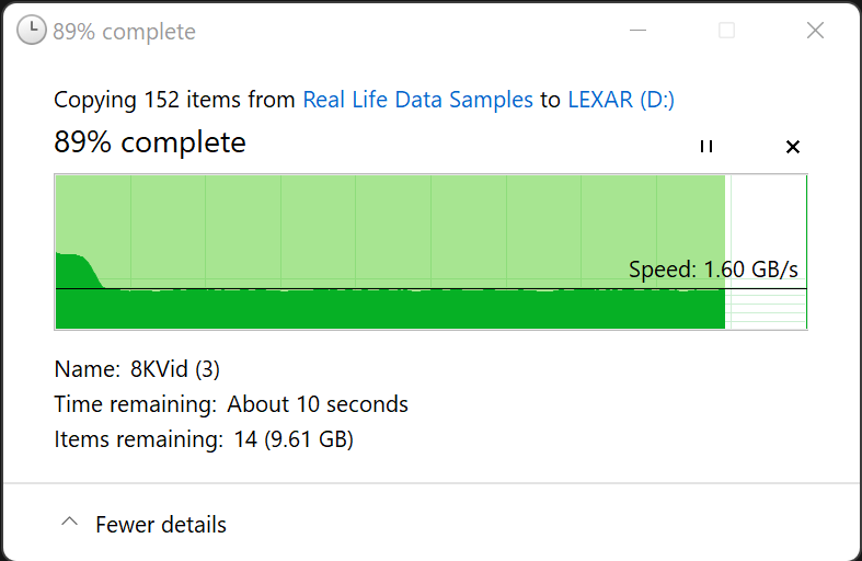 We determine sustained write performance by transferring a 85GB 8K media folder from the PC to the CFexpress Type B card. This test is vital to those looking at digital storage for high end 4K and 8K video recording.