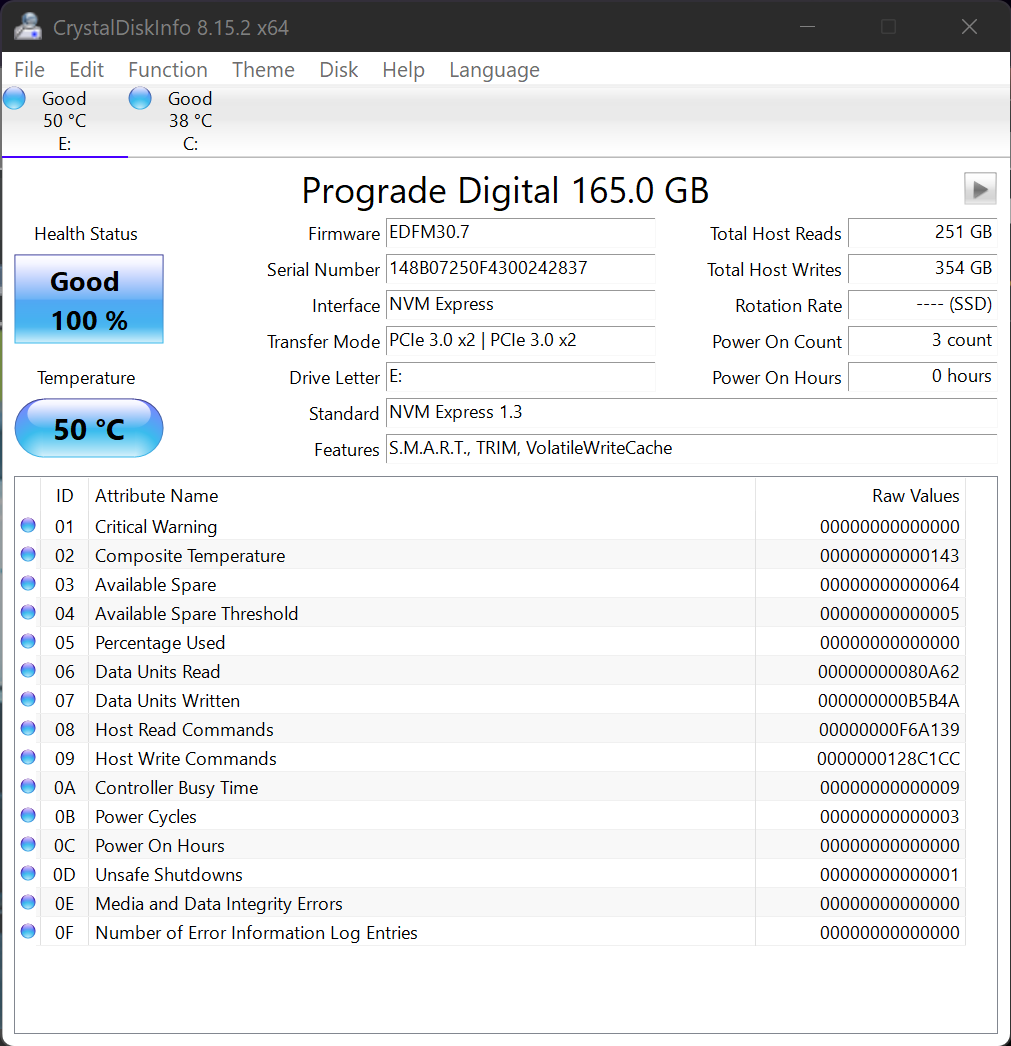 Crystal Disk Info is a great tool for displaying the characteristics and health of storage devices. It displays everything from temperatures, the number of hours the device has been powered, and even to the extent of informing you of the firmware of the device.