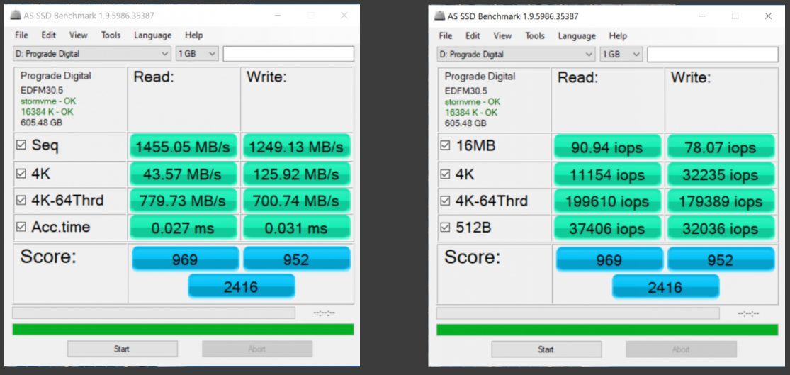The AJA Video Systems Disk Test is relatively new to our testing and tests the transfer speed of video files with different resolutions and Codec.