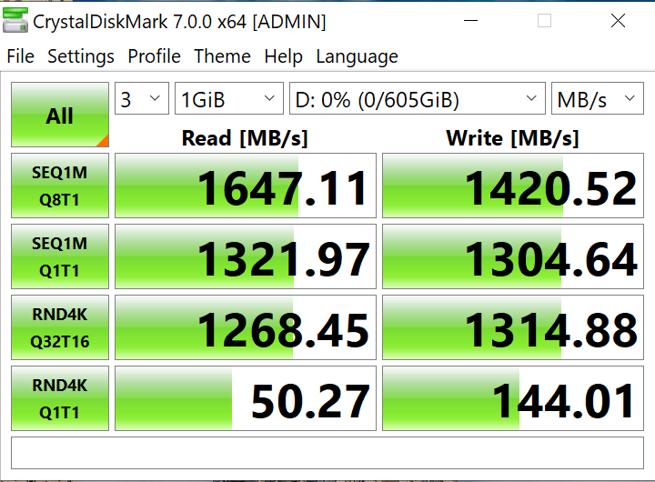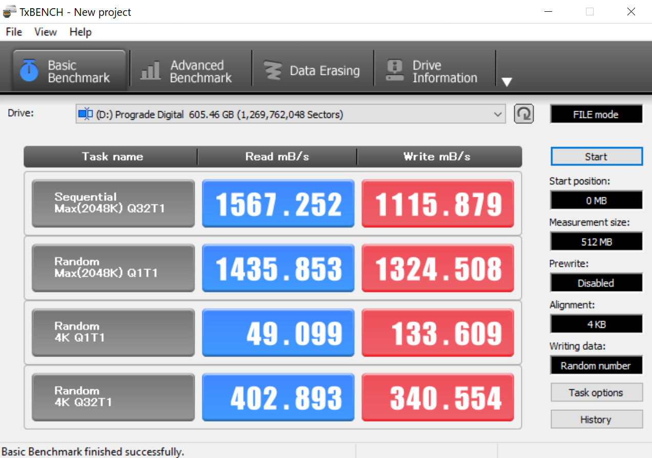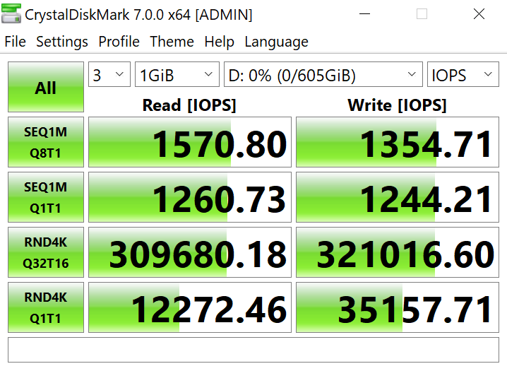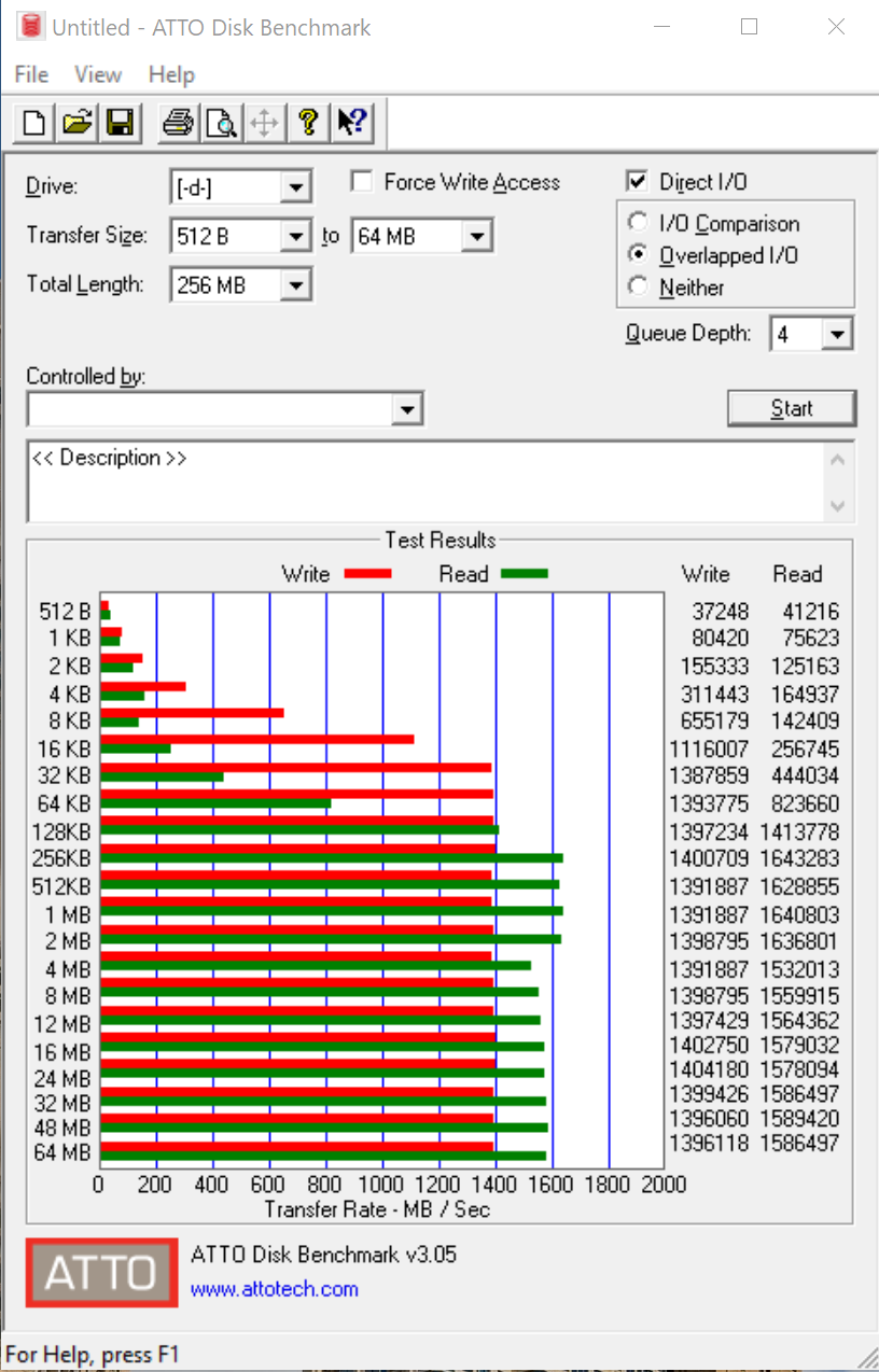 It was very good to see a steady progression of performance with the increase of file size. High readings were just under 1.6GB/s read and 1.4GB/s write.
