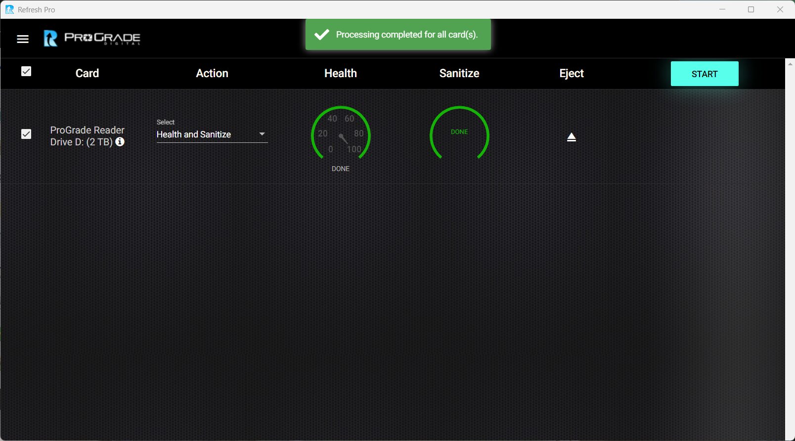 ProGrade takes things even further. They have what they term as ‘Triple Protection’ which combines their 3-year warranty, laser etched serial numbers into the metal casing to dissuade copycat imitations, as well as a great compliment of software for these memory cards. Purchase of the PG Gold 4.0 includes a Quick Start Guide that directs one to three software programs, RefreshPro, Recovery Pro and Ingest Pro. This is the refresh Pro UI. Simplicity.