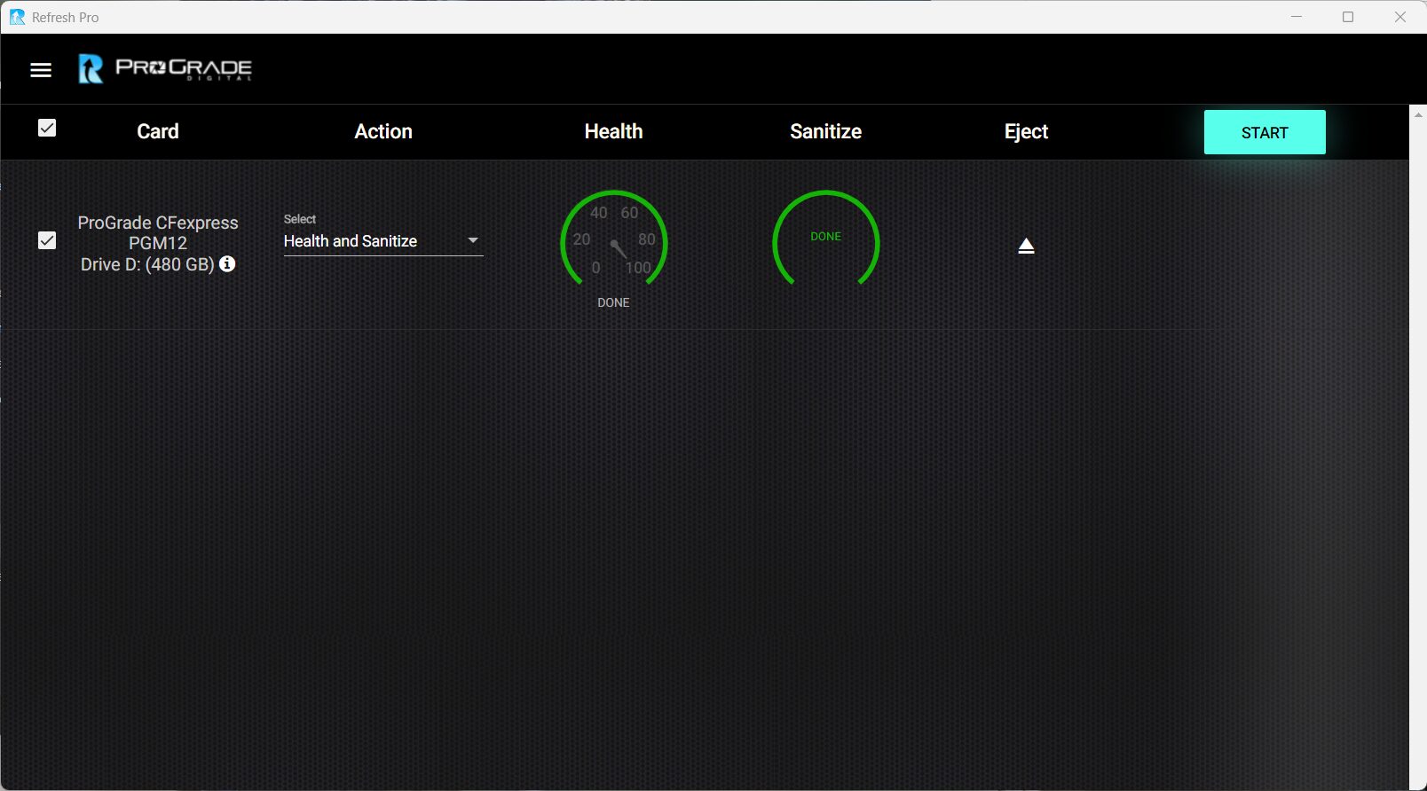 Listed specifications include 900MB/s read, 800MB/s write with a sustained write performance of 600MB/s which is well above the VPG 200 minimum speed. ProGrade also has several software programs to help in keeping your media and storage in shape to include Ingest Pro, Recovery Pro and Refresh Pro. Refresh Pro is a very minimalist UI that allows one to check the health of their card, as well as sanitizing it without having to leave Windows.