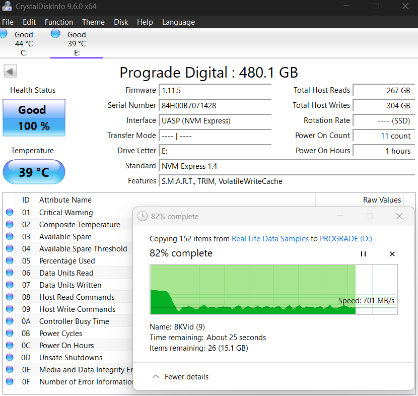 Two characteristics that became very important with the introduction of CFexpress as a mainstream storage medium were temperature and sustained write speeds. We measure temperature by monitoring and updating a Crystal DiskInfo Benchmark while a large 85GB 8K file transfer is being performed. This is the extreme of what one might see in this environment. An important aspect to remember is that the temperature results we obtain are the extreme. They are the hottest the card got during any period of our testing which was constantly monitored. It does not speak to the median or typical temperatures one might expect which would be around the low 30°C mark.
