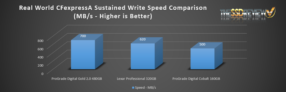 The ProGrade Digital Gold 2.0 CFExpressA 480GB Memory Card held a sustained write speed average of 700MB/s throughout the transfer which is well above the minimum standard of 500MB/s.