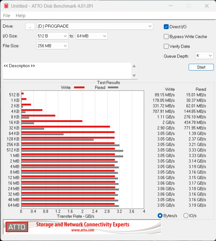 ATTO Disk Benchmark is perhaps one of the oldest benchmarks going and is definitely the main staple for manufacturer performance specifications. ATTO uses RAW or compressible data and, for our benchmarks, we use a set length of 256mb and test both the read and write performance of various transfer sizes ranging from 0.5 to 8192kb. Manufacturers prefer this method of testing as it deals with raw (compressible) data rather than random (includes incompressible data) which, although more realistic, results in lower performance results.