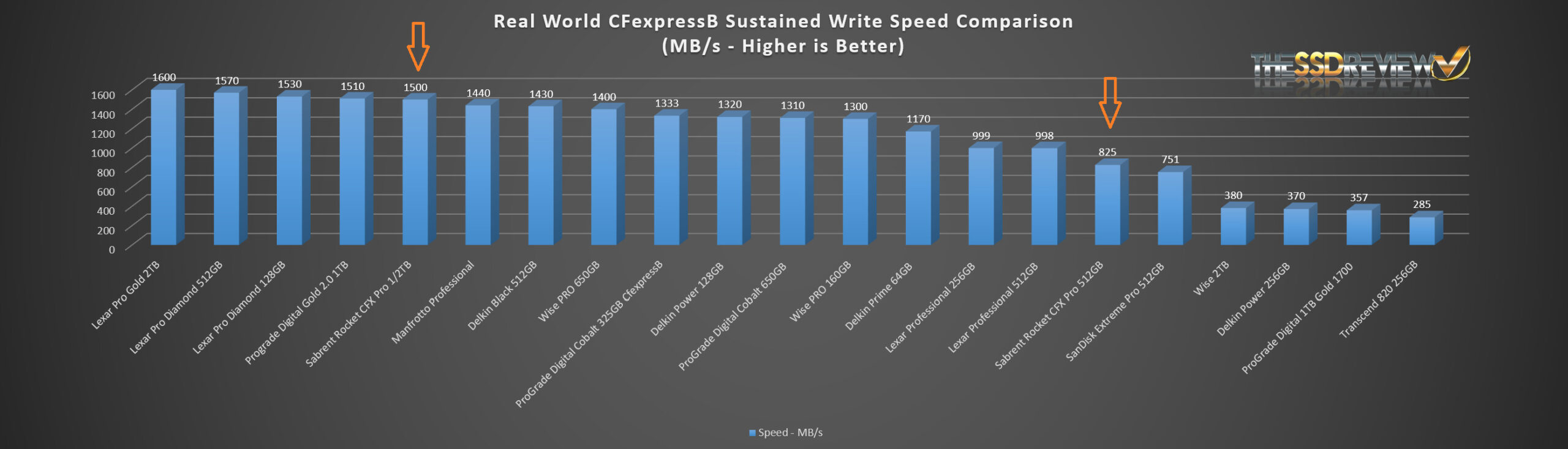 Sustained write performance of 1.5GB/s for the 1/2TB version of the Sabrent Rocket CFX Pro CFExpress Type B memory card is excellent, although we see this drop to 825MB/s for the 512GB version. There is absolutely nothing wrong with this as it easily doubles that of the VPG400 standard which is the industry standard as a minimum for professional video capture, as well as that required to utilize all features within specific digital equipment as the Canon EOS R5 camera.