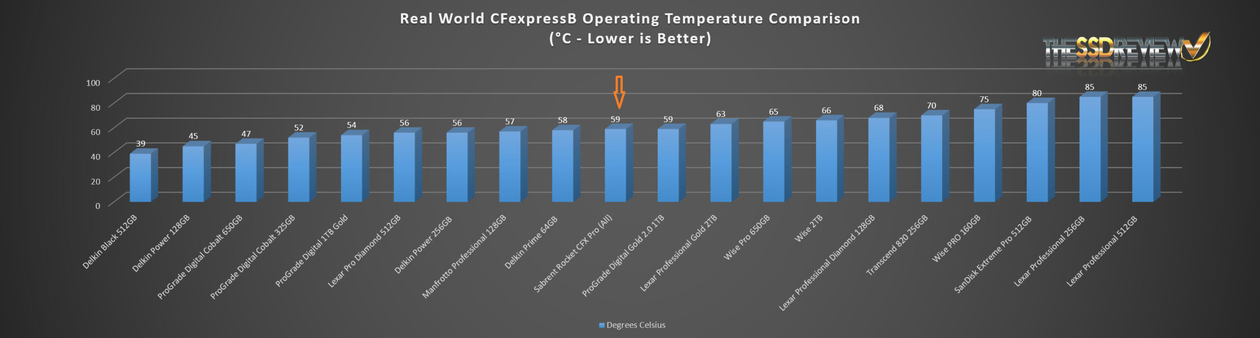 Temperature was decent for all capacities of the Sabrent Rocket CFX Pro, remaining at the mid-range of all tested to date.