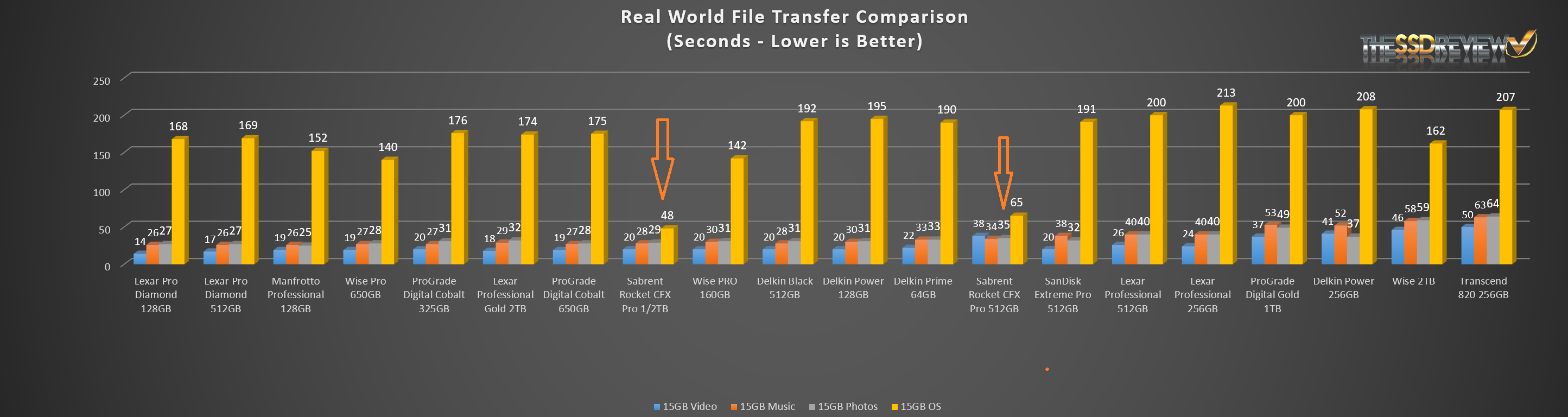 For our Real World File Transfer Comparison of the world’s top CFexpress Type B cards, we have included all cards that we have received to date. This test is conducted through the transfer of data from one spot on the test drive to another to give us the truest of transfer speed results for that device.