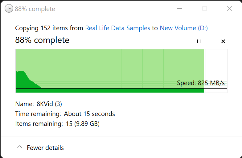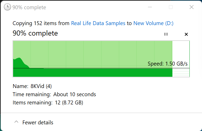 We determine sustained write performance by transferring a 85GB 8K media folder from the PC to the CFexpress Type B card. This test is vital to those looking at digital storage for high end 4K and 8K video recording.