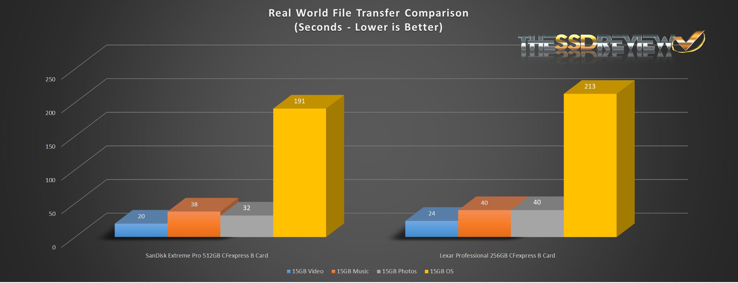 We have put the SanDisk Extreme Pro beside the Lexar Professional CFexpress B Card for our true to life data testing. In this test, we simply place 15GB files representing music, video, pictures and operating systems onto the target drive. We then copy each file from one place on the target disk to another, recording the time taken for the transfer.