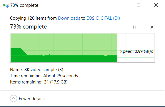 With today’s new cameras pushing the bar just a bit more, there is a new found need to understand the affect that sustained write speeds have on a cameras ability to record and store digital media.. The Canon R5 is a perfect example because of its ability to film video in 8k and higher 4K resolution. A card with low sustained write speeds simply will not keep up as that video data is being stored concurrent to filming. For our testing today it is rather simple, in that, we compiled 45GB in 8K video files and moved them to the disk monitoring the speed.. To confirm this, we also did another transfer from location to location on the SanDisk Extreme Pro CFexpress B Card and confirmed the exact same speeds……just over 751MB/s.