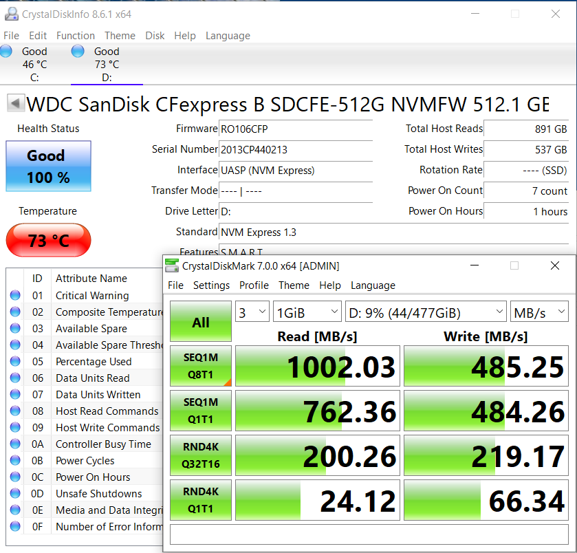 We learned through this test that the SanDisk Extreme Pro CFexpress B 512GB Card starts to thermal throttle at 65C. We wanted to see how this affected other benchmarks so threw in a Crystal DiskMark score where the most notable drop was write performance at 485MB/s. We received the same results with respect to sustained write speeds through our AIC card and the card reader, the card reader result shown here.