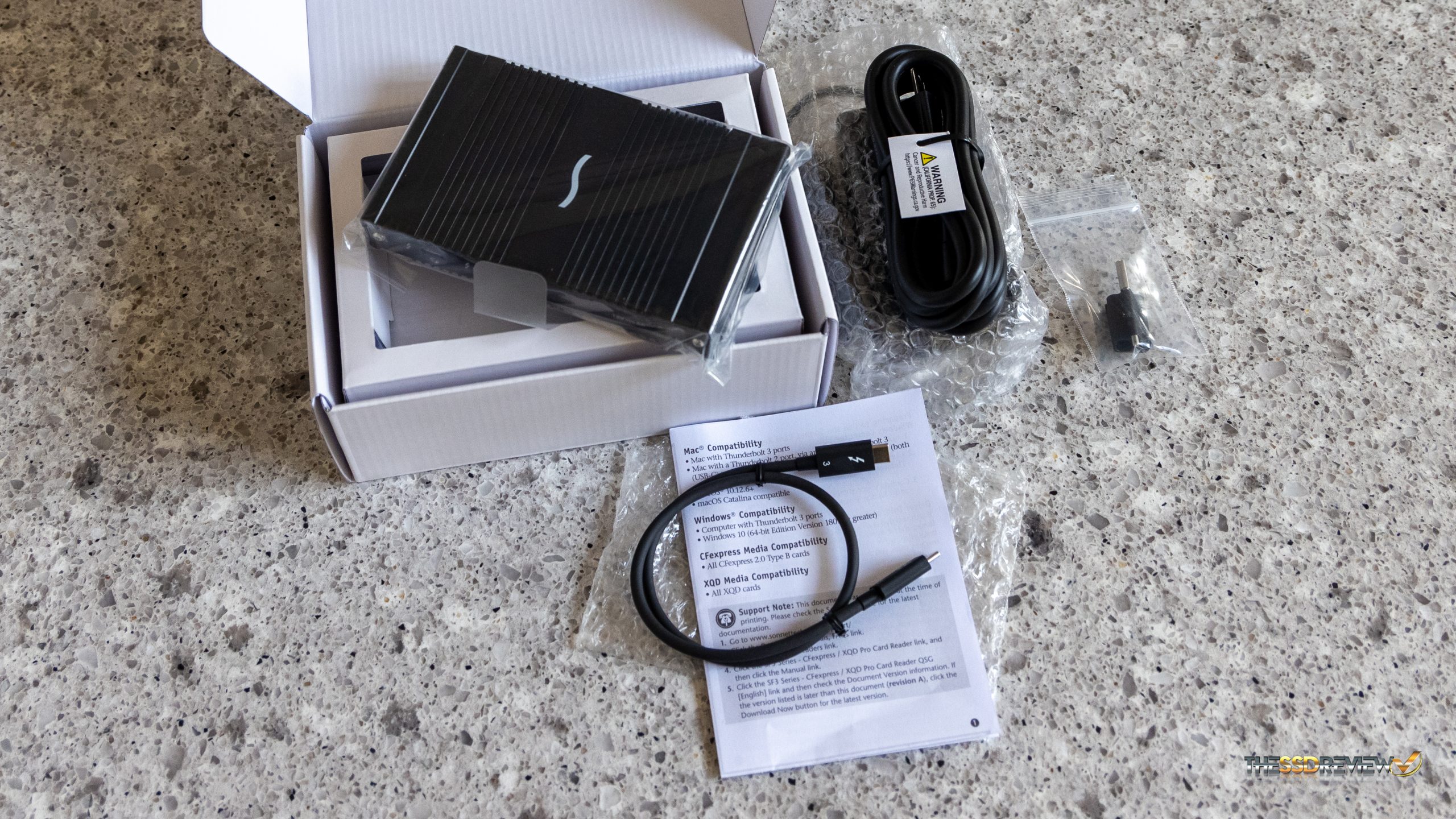 SF3 packaging contains the SF3 itself, a power adapter, a Quick Start guide, Thunderbolt 3 cable and a ThunderLok 3 connector that screws into the back of the unit to hold your cable securely in place.