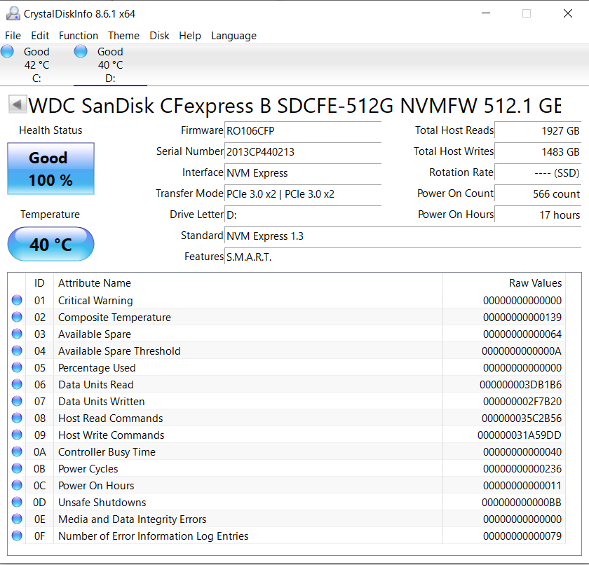 As can be seen in this photo above, The exterior construction is a ribbed aluminum which serves as a heatsink for the device as continuous data transfer speeds up to 1800MB/s can get hot. A quick look at the Crystal DiskInfo result for the SanDisk Extreme Pro validates that we are moving data at PCIe 3.0 x2 (2 lane) speeds.