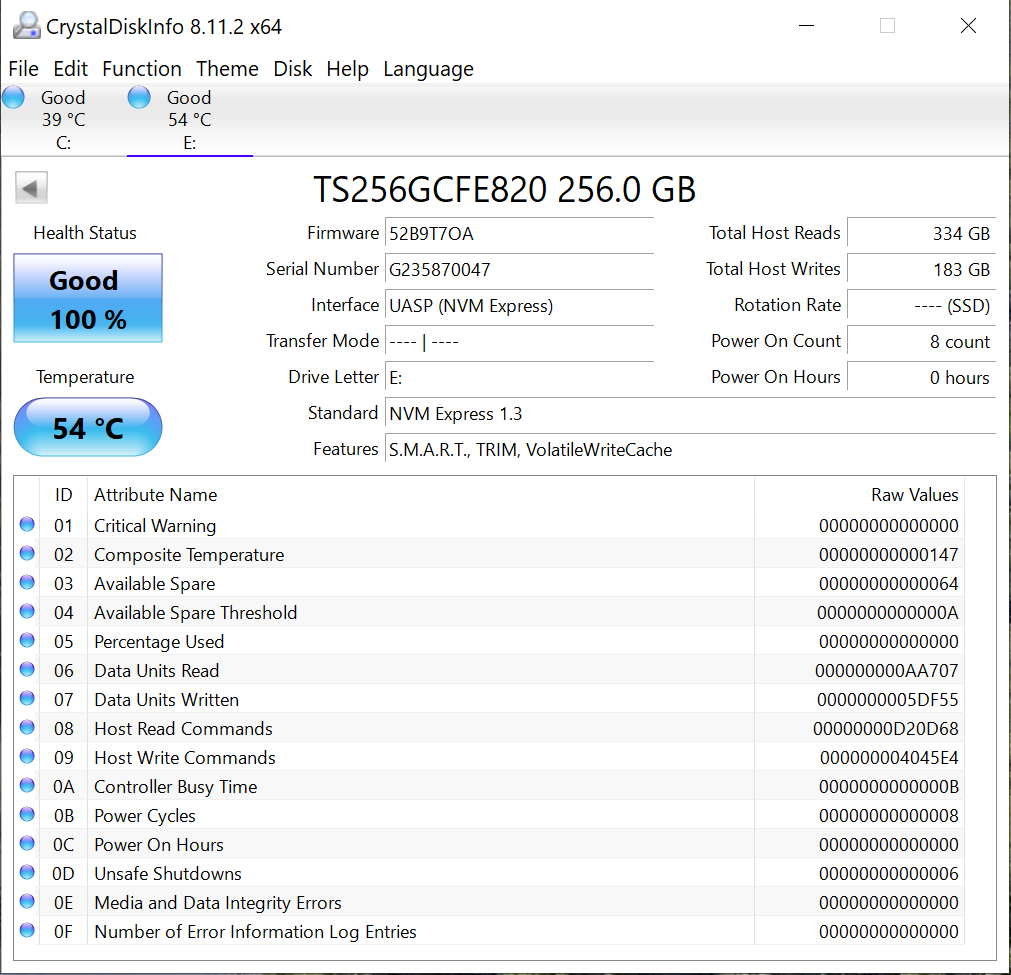 Crystal Disk Info is a great tool for displaying the characteristics and health of storage devices. It displays everything from temperatures, the number of hours the device has been powered, and even to the extent of informing you of the firmware of the device.