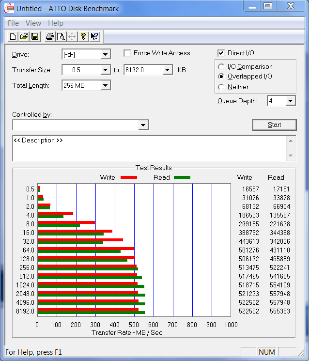 ATTO Disk Benchmark scores of 555MB/s read and 525MB/s write are almost dead on with listed specifications which is always nice to see.