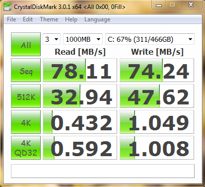 On HDD only, I got : 76MB/s read and 75MB/s write