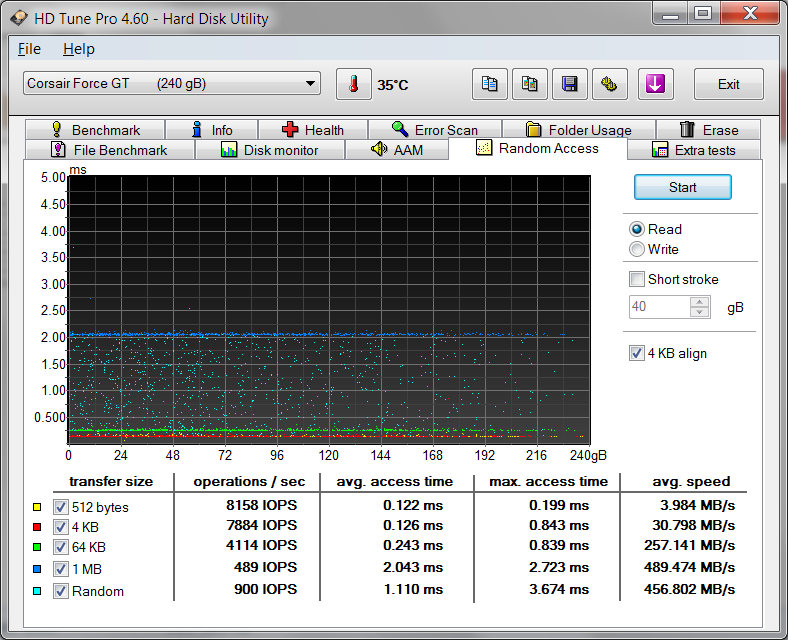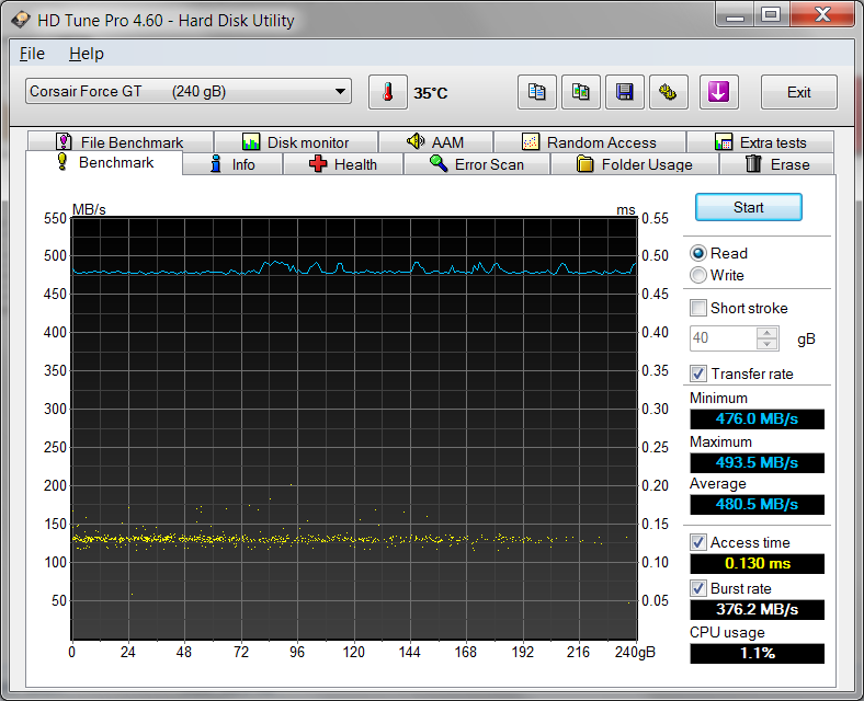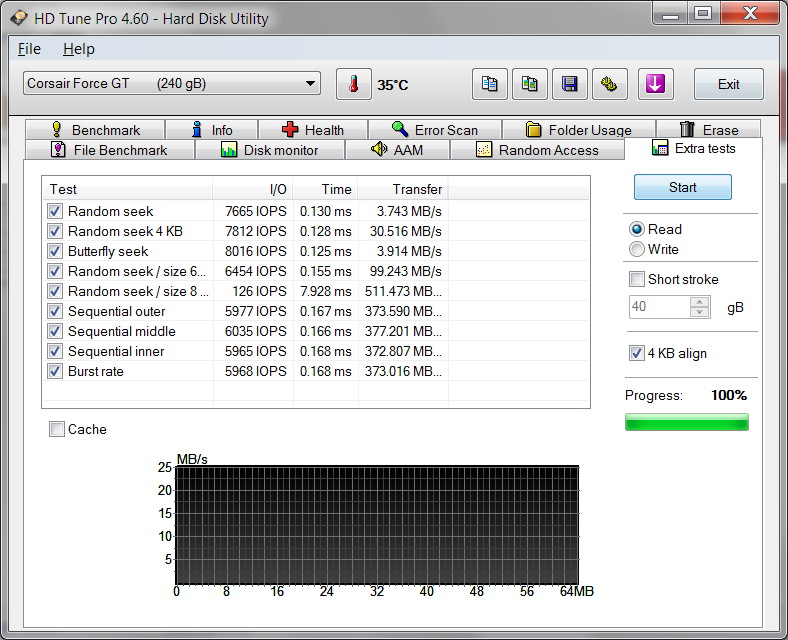 The thing we like most about HDTune Pro is its ability to show us that the Corsair Force GT is comfortable with SATA 3 speeds in several of the tests as is obvious with the last two charts.