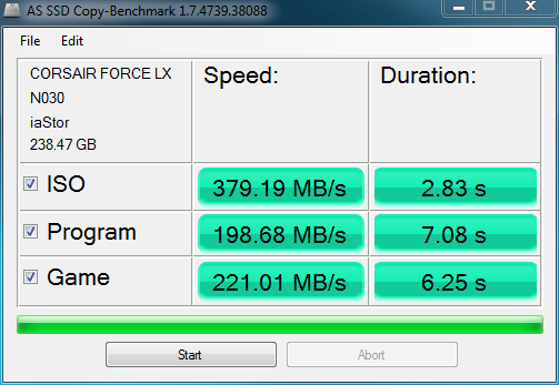 The Force LX SSD ran through our PCMark Vantage benchmark test fairly well, and returned a total score of 72280, which is excellent considering that this is a budget-friendly option for upgrading your SSD. The Corsair SSD also returned six scores that surpassed the 300 MB/s mark.
